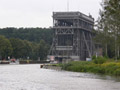 das Schiffshebewerk in Niederfinow ist ein immer noch in Betrieb befindliches technisches Denkmal; unmittelbar steht ein noch größeres Hebewerk im Bau; Inbetriebnahme im Jahr zweitausend und ??