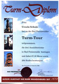 mittlerweile eine traditionelle Institution ist das Erwandern des "Turmdiploms" wenn man die vier Türme Bismarkturm, Eulenturm, Schanzenturm und Aussichtsturm Bad Freienwalde bestiegen hat.